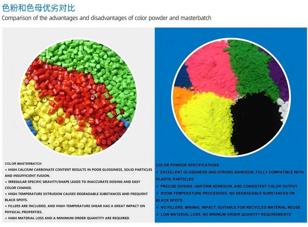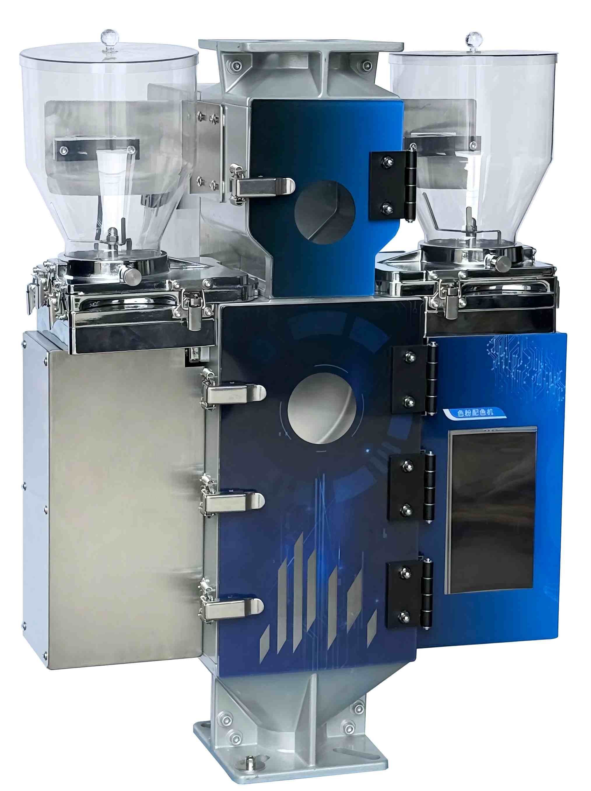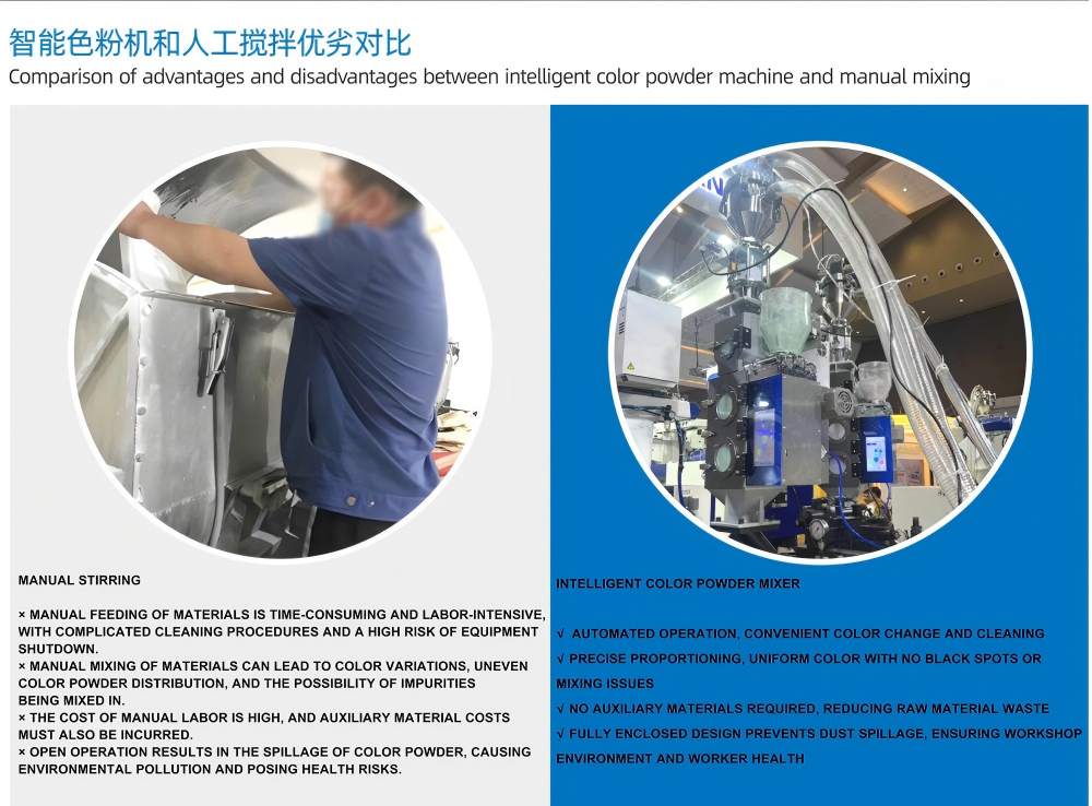 100 키로그램/시간"지능형 컬러 파우더 혼합"은 중앙 공급 시스템, 중앙 운반 시스템 및 자동 재료 처리 시스템과 완벽하게 통합될 수 있습니다. 플라스틱 색상 혼합기에는 고정밀 계량 센서가 장착되어 있어 혼합 과정의 균일성과 색상의 일관성을 보장하고 다성분 분말 및 첨가제의 자동 비율 조정을 지원합니다.